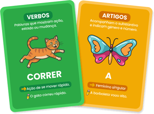 50 cartas pedagógicas que tornam o ensino de gramática mais claro, visual e acessível para os alunos do 1º ao 5º ano.